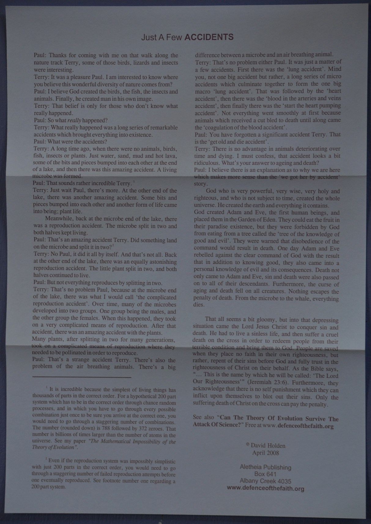 - "Just A Few Accidents" or "The Beginning of Everything". Those who want to go a little deeper in this area of study should read, "Can The Theory of Evolution Survive The Attack of Science?" also "The Mathematical Impossibility of the Theory of Evolution" for those who like maths.