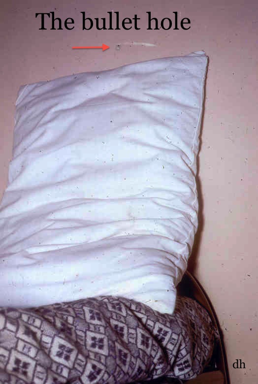 A couple of weeks after my narrow escape, I repositioned the pillow against the wall and took this photo with my cheap camera. The photo has a few slight blemishes because of age. - Go