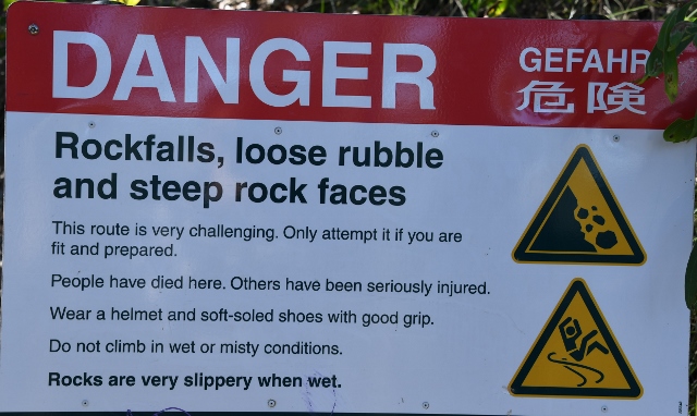 My photo of Mount Tibrogargan (GPS: 26 deg 56' S x 152 deg. 57' E) is of the eastern side. We climbed the western side because the slope is much more managable. Obtaining a good photo of the western side is not easy because of the many trees near the mountain blocking the view. I climbed part of the way up Mount Tibrogargan on Friday 13 July 2018 and took a photo of one of the danger signs (GPS: -26.9267 x 152.9426 E). (Photo)