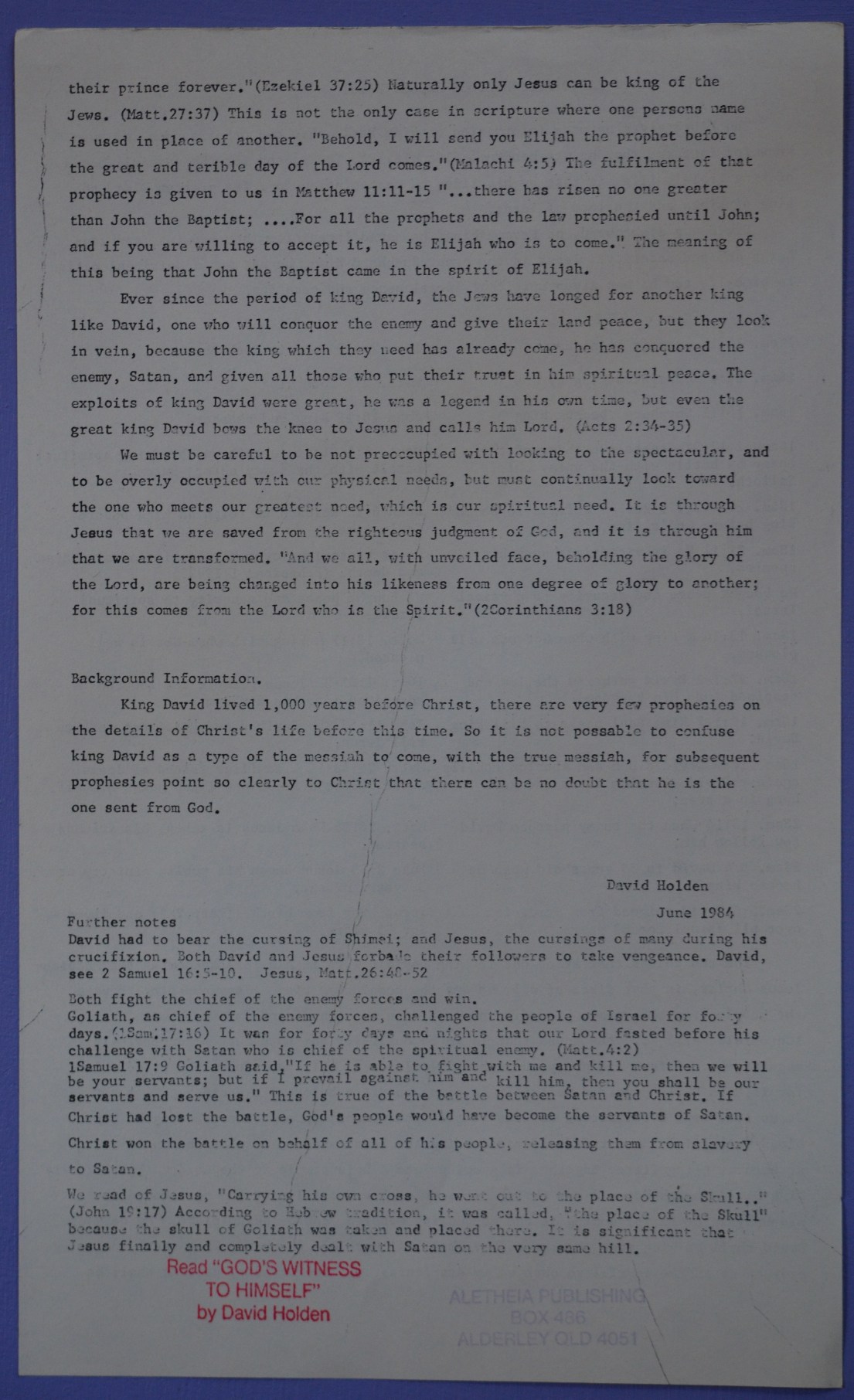 Another paper which generated wide interest is titled, God's Covenant With King David. It started out as two foolscap pages in June 1984, which was later developed into a larger article. It was produced on a typewriter which basically punched the letters onto a special sheet which, upon completion of the article, was transferred to a 'Roneo' machine. The machine forced ink through the punched letters onto paper. The result was a little rough by today's standards, but it was quite readable. A lot of people gained their first taste of typology by reading that basic (1984) outline on King David. The revised and expanded article became chapter twelve in my book, God's Witness To Himself. The article on King David is now available on the web site and continues to gain a lot of interest.